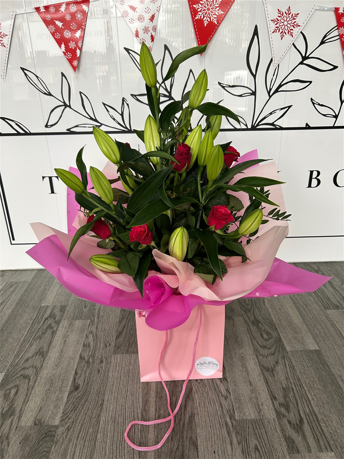 Our bouquets filled with lilies, roses & greenery are both modern and elegant. Once in full bloom, this bouquet is simply stunning, and the scent is divine!
