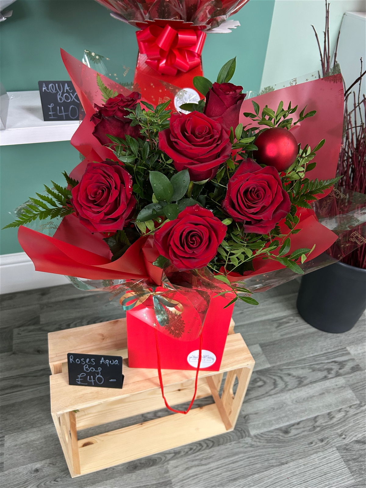 Long Stem Red Roses & Greenery Aqua