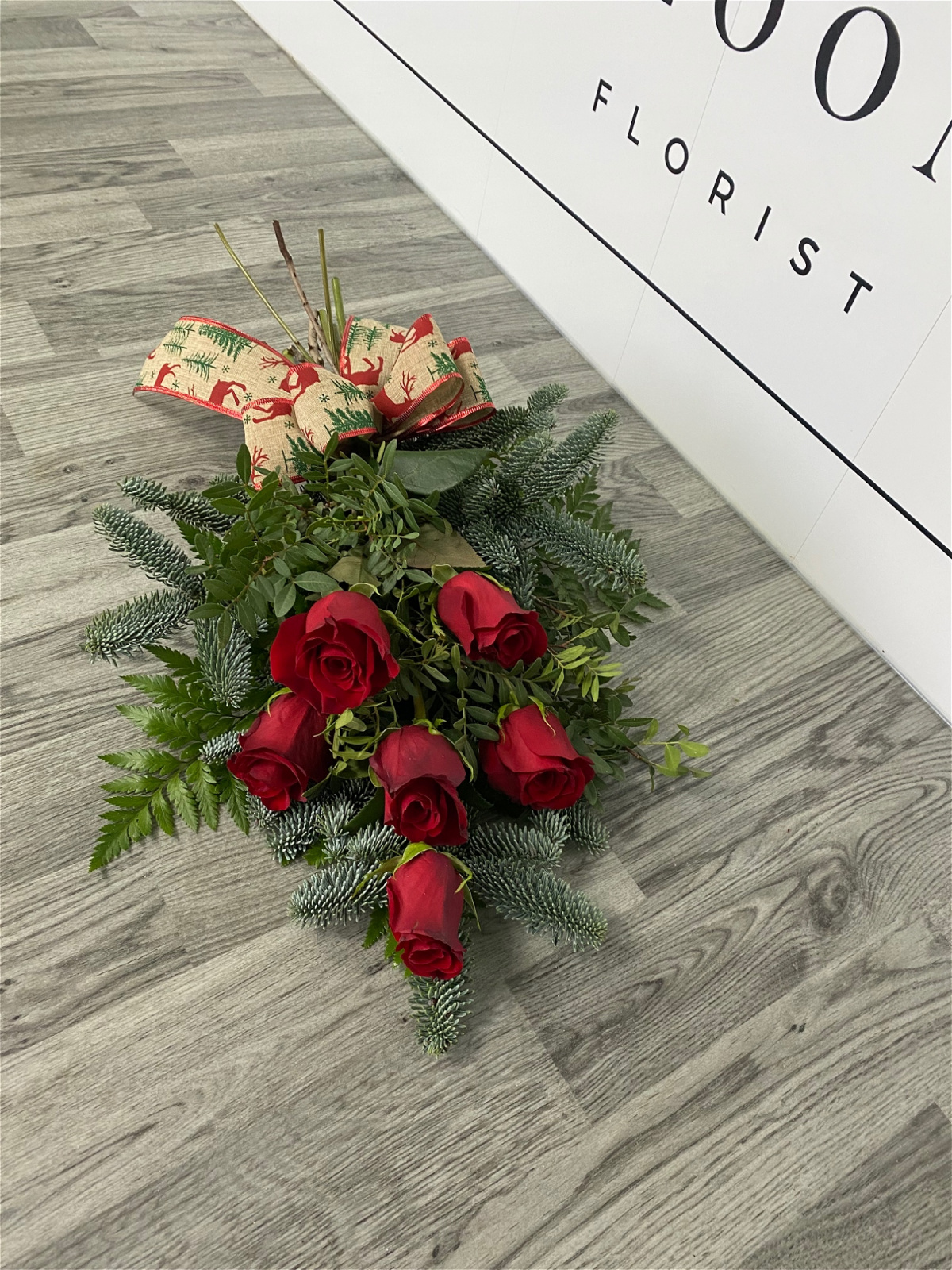 6 or 12 beautiful long stem red roses with a selected of festive greenery including Scottish spruce.